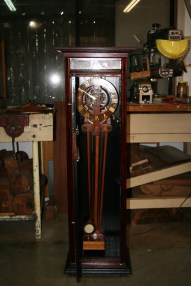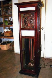Now that the movement has been “electrified” I needed a case to mount it in. This case is 1500mm high and I call it my grandmother case because it is not tall enough to be a grandfather case. Sides are stained Jarrah back is pine.