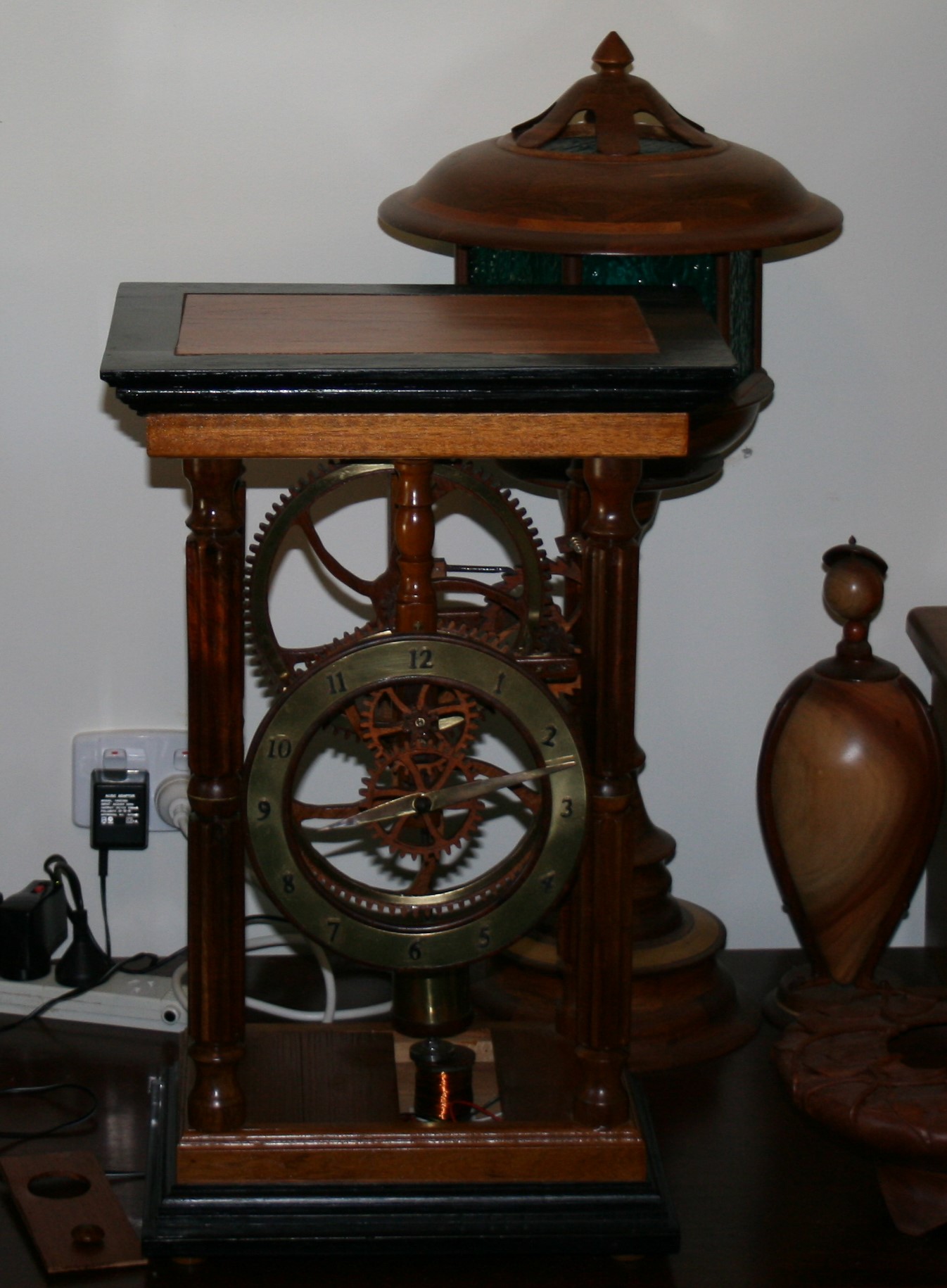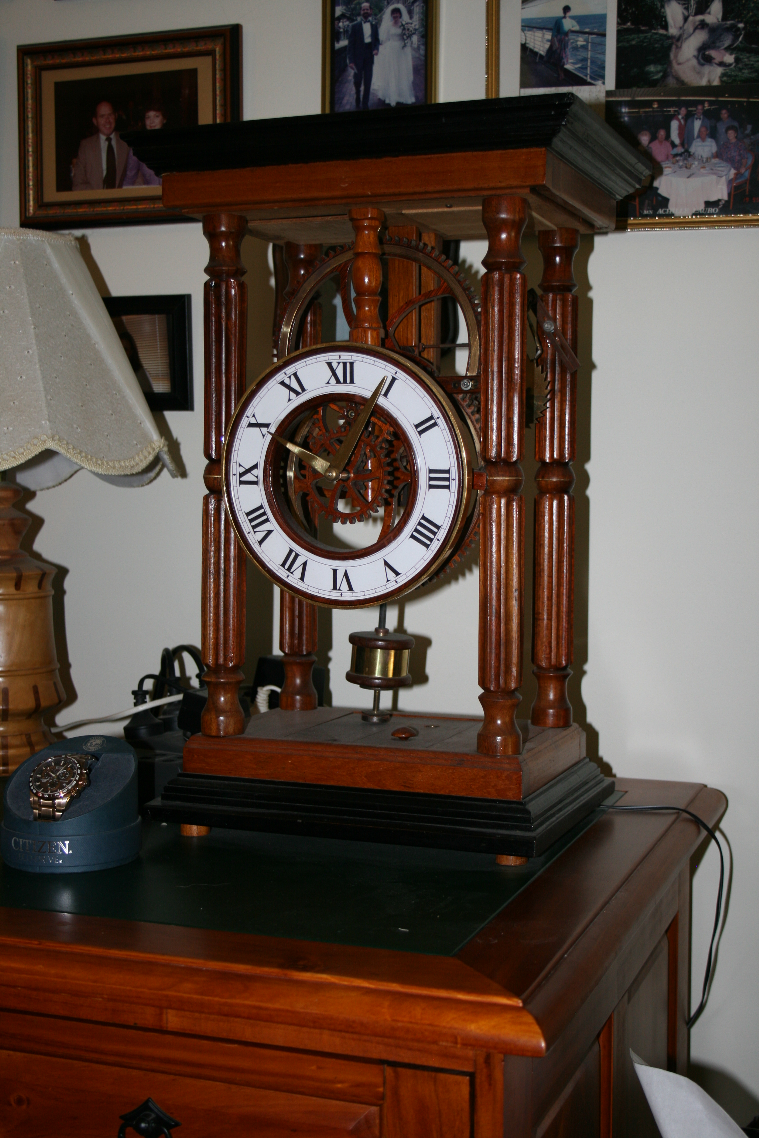 The final modification and I am now happy to leave it as it is. The traditional dial with roman numerals is easy to read. It is encased with a gold plated brass ring which was a reject from a boat’s porthole. It achieves my original objective, that is an accuracy of between 1 to 2 minutes a week. It now sits on one side of my computer. |