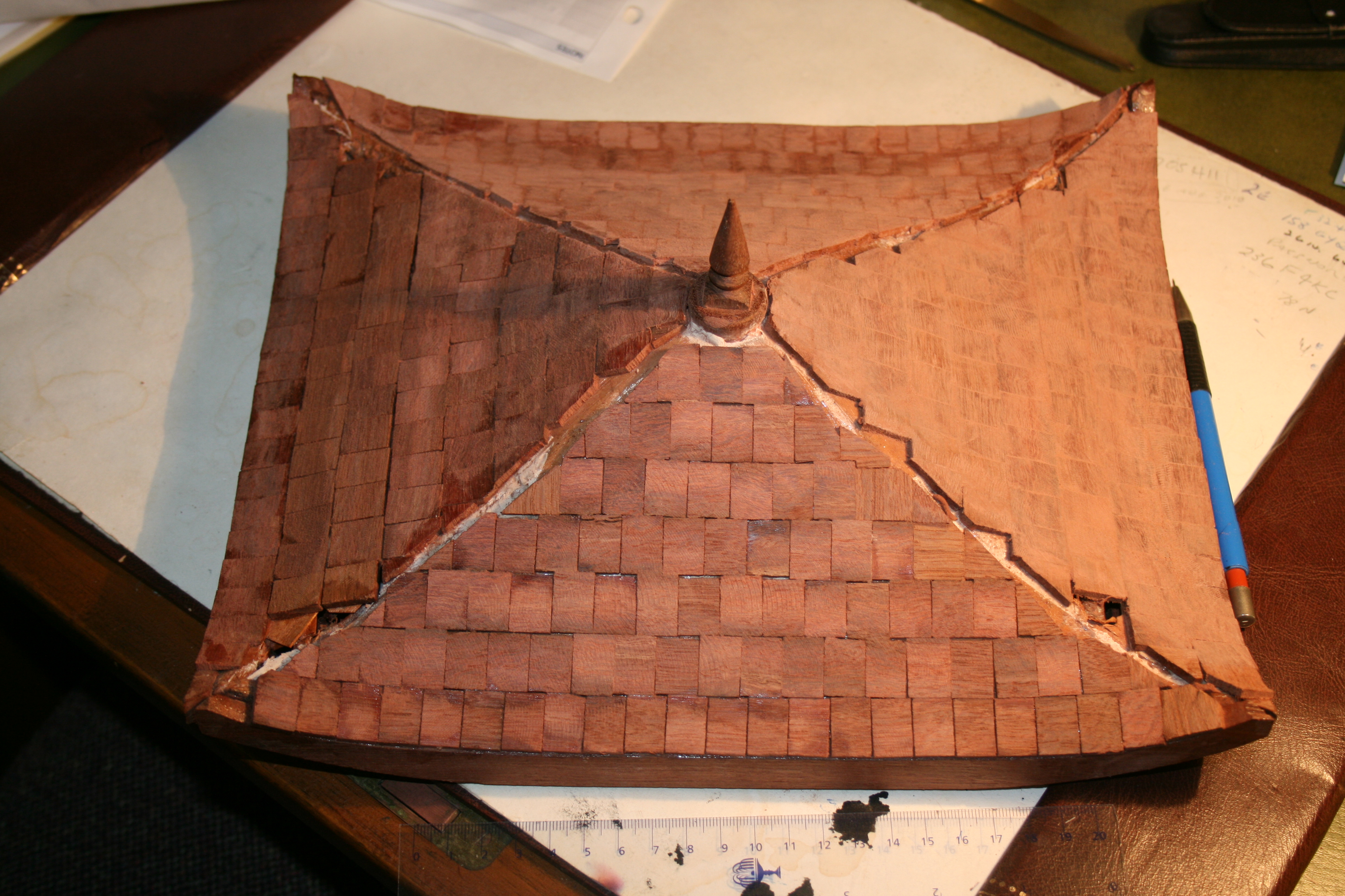 This is the roof under construction. I used small wooden tiles made of Jarrah.