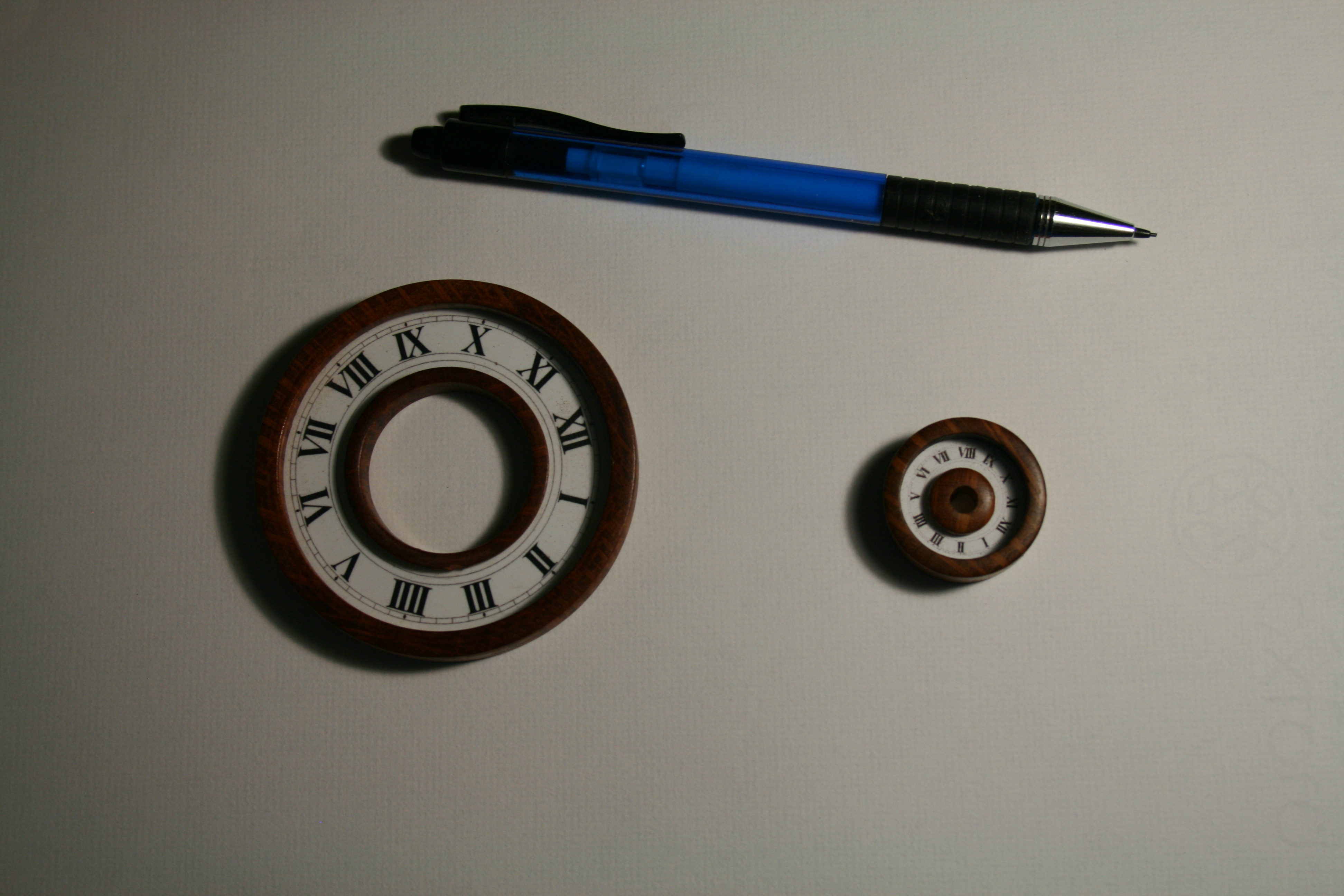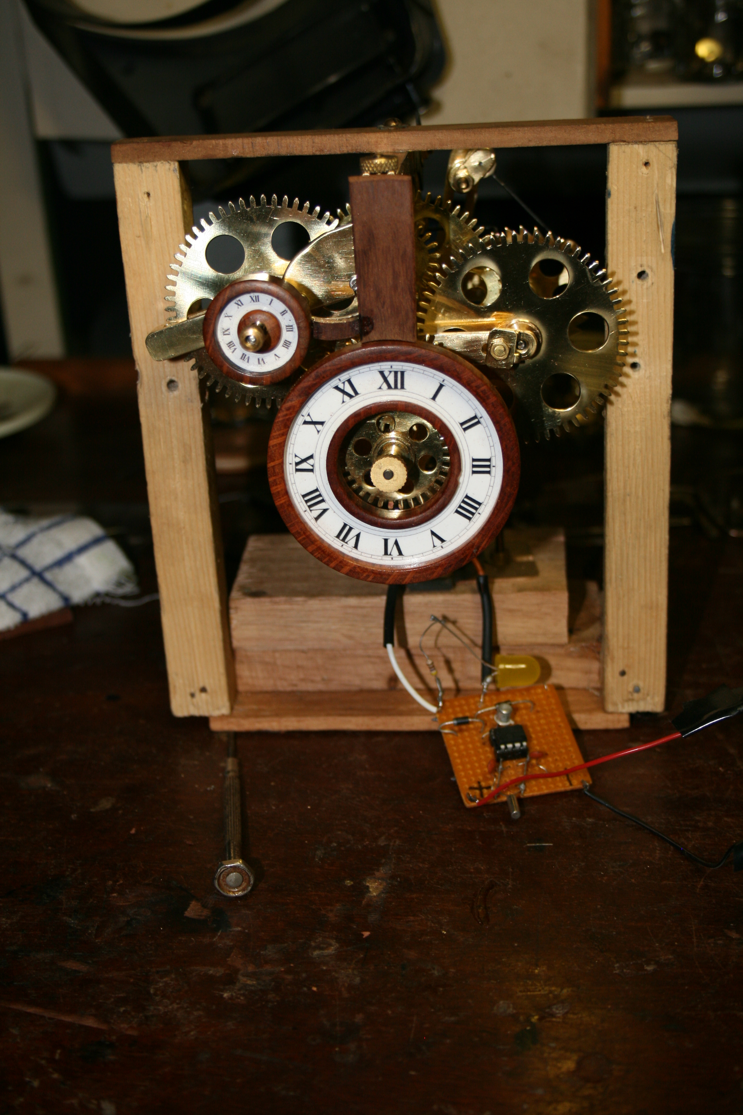 | This is the smallest and also the first non pendulum clock I have built. The idea of using an air solenoid developed from a clock I saw on the net called the Lazy Clock which moves the hands each minute. I wanted to make it more interesting than that and use a 30 teeth count wheel. I understand that the original idea was used by a Russian horologist about a hundred years ago. I use an integrated circuit (see electronics) to control the air solenoid with a 20mm by 6mm magnet as the driving force. While it works quite well it is a bit noisy and I may modify it some stage and install the more successful lever system that I used in clock 10. . |