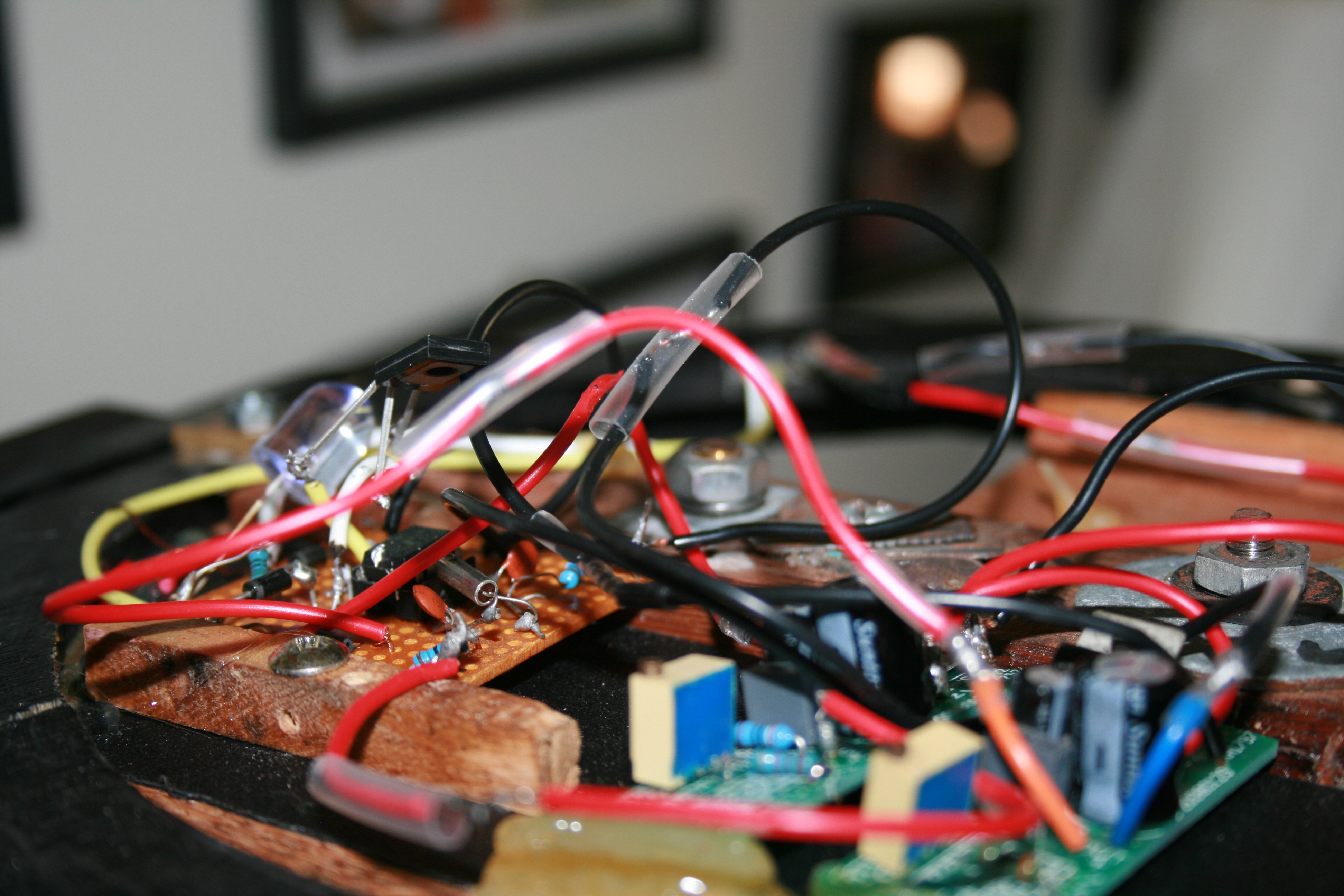 This is one of Bruce’s original switches. Behind the LED is an 8 legged integrated circuit. It is a 12f683 and I will talk a little more about it in the section on software. |